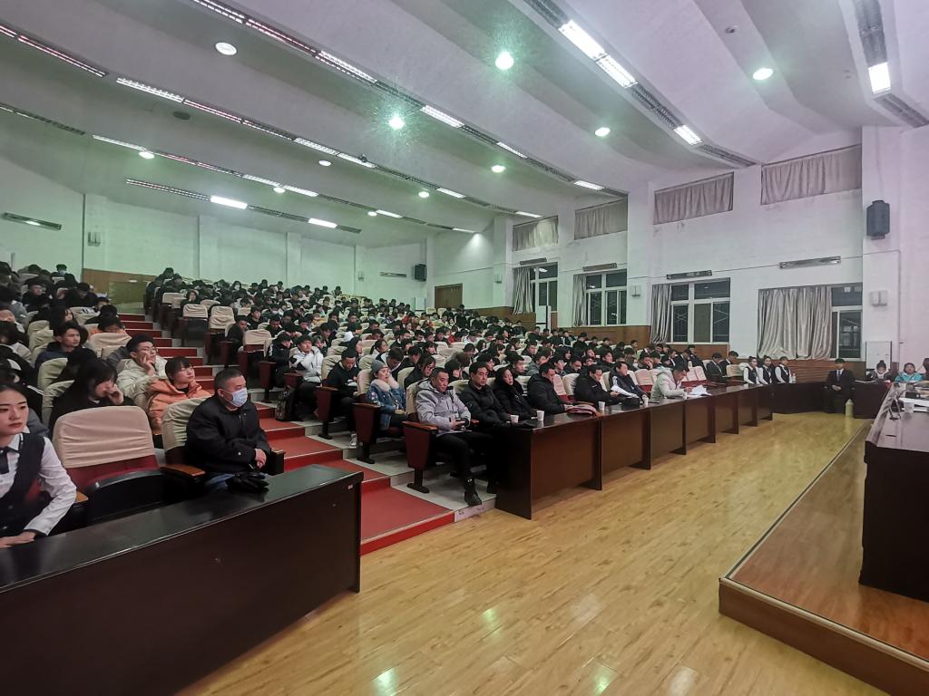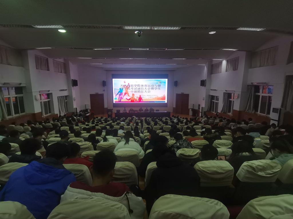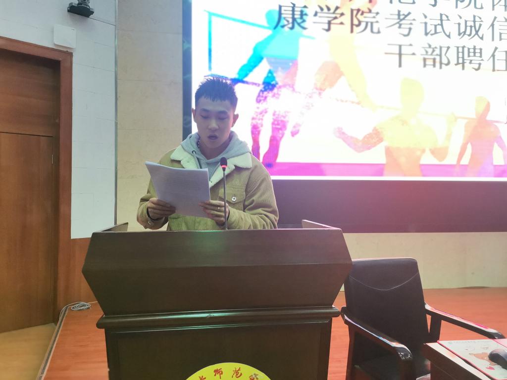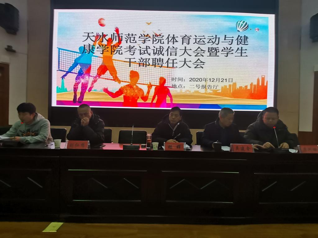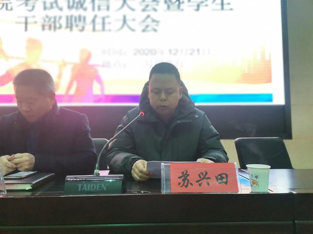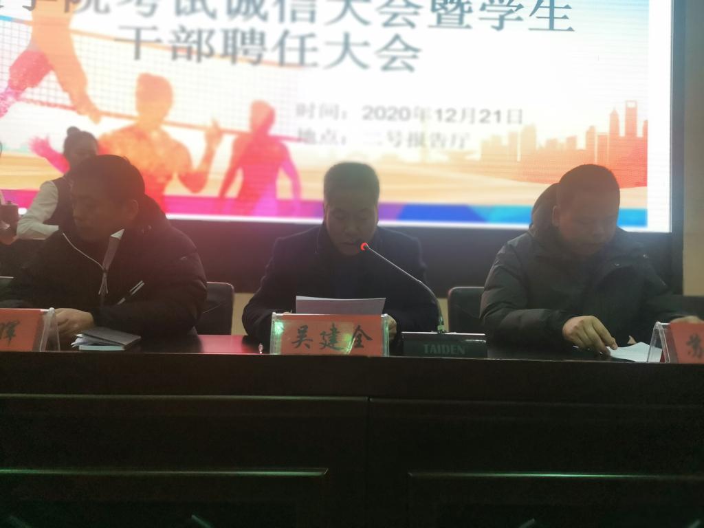 12月21日晚,外围买球的app十大平台在二号报告厅召开考试诚信教育大会暨学生干部聘任大会,学院党政领导班子,各教学系(部)主任,辅导员,19级、20级各班班主任,20级全体学生,以及19级、18级、17级各班学生代表共计370多人参加。大会由学院团委书记王昊支持。