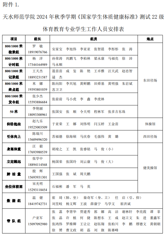附件1.天水师范学院2024年秋季学期《国家学生体质健康标准》测试22级体育教育专业学生工作人员安排表
