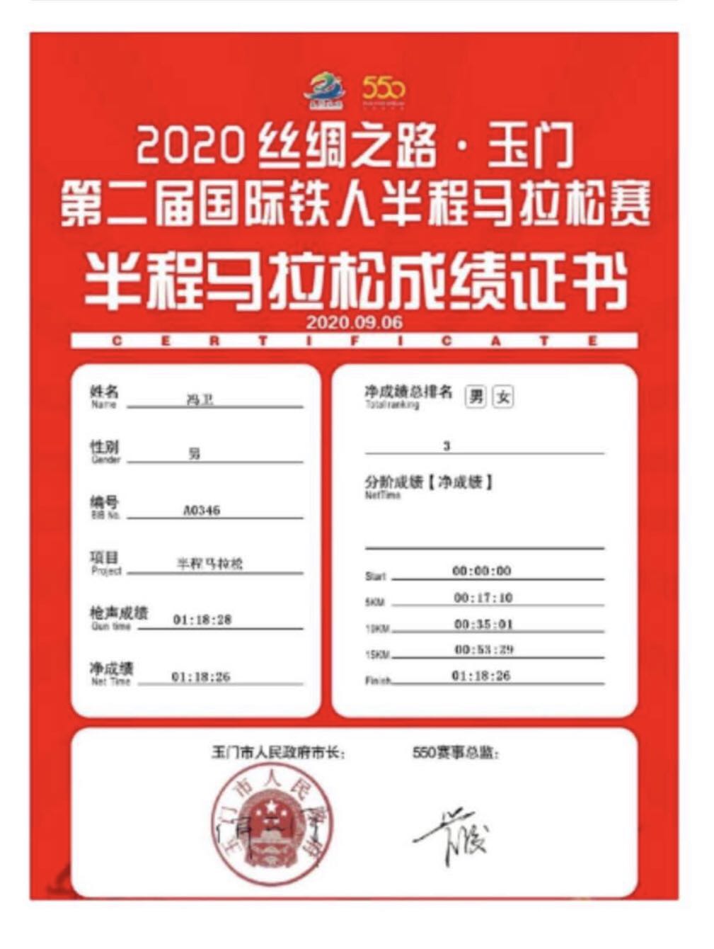 由甘肃省体育局、玉门市人民政府主办,玉门市文体广电和旅游局、玉门市体育中心、玉门市委直属机关工委承办,戈友文化传媒(上海)有限公司运营的2020丝绸之路.玉门第二届国际铁人半程马拉松赛于9月6日在玉门市政广场鸣枪开赛,有来自全国19个省份,60多个城市,共计5000名专业马拉松选手参加本次比赛,外围买球官网运动训练专业2018级冯卫同学,在比赛中不畏强手,最终以1小时18分26秒获得男子组第三名的好成绩,为我校争得了荣誉!