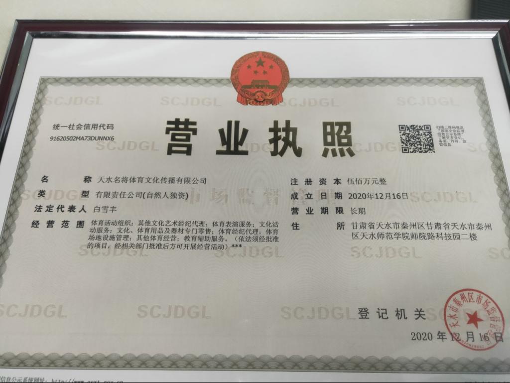在外围买球的app十大平台的教学改革之中,积极鼓励学生自主创业。由体育教育专业在校学生申请注册的“天水名将体育文化传播公司”于2020年12月正式成立。该公司主要经营范围是体育培训、体育活动组织、体育表演服务、教育辅助服务等。